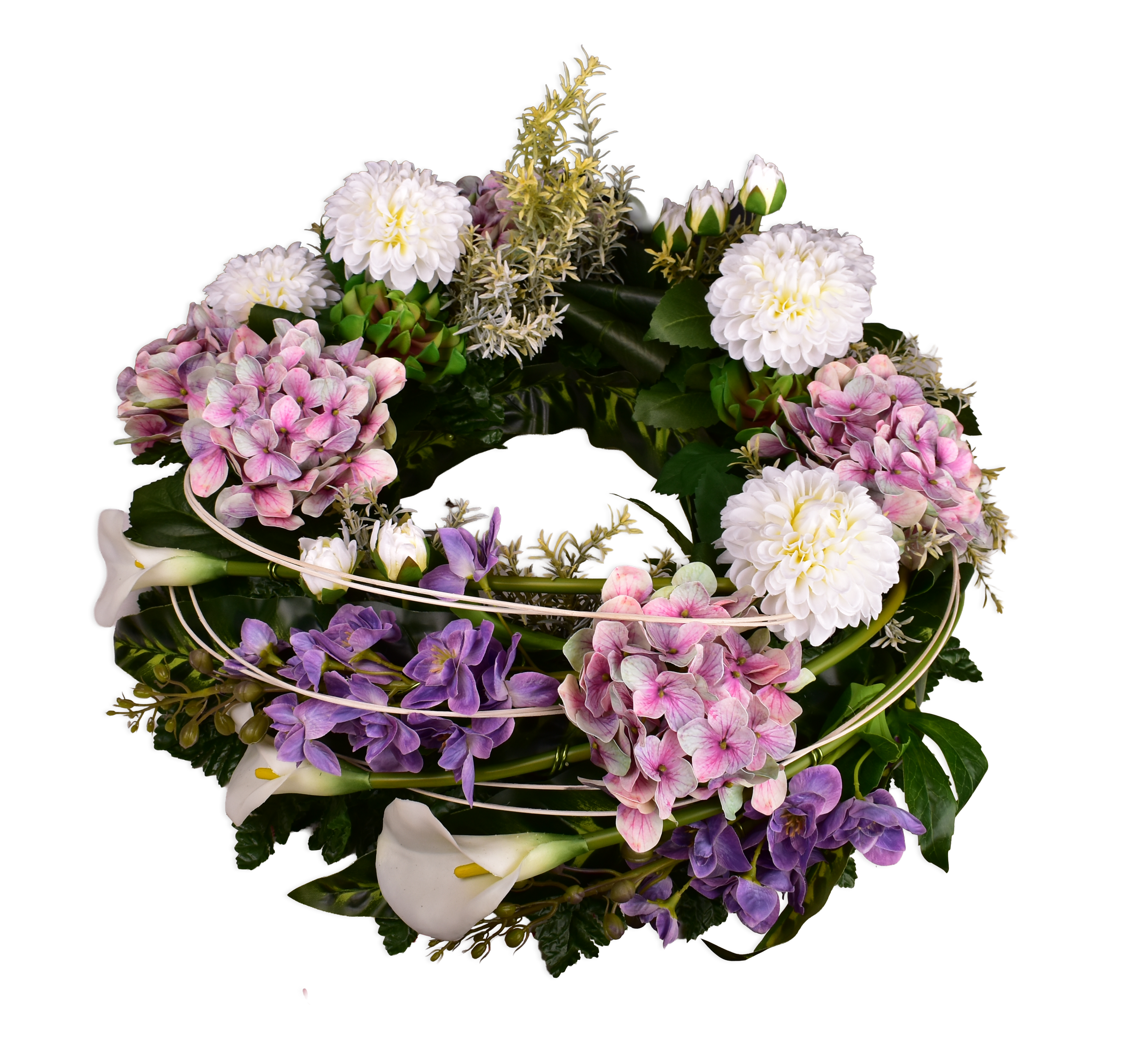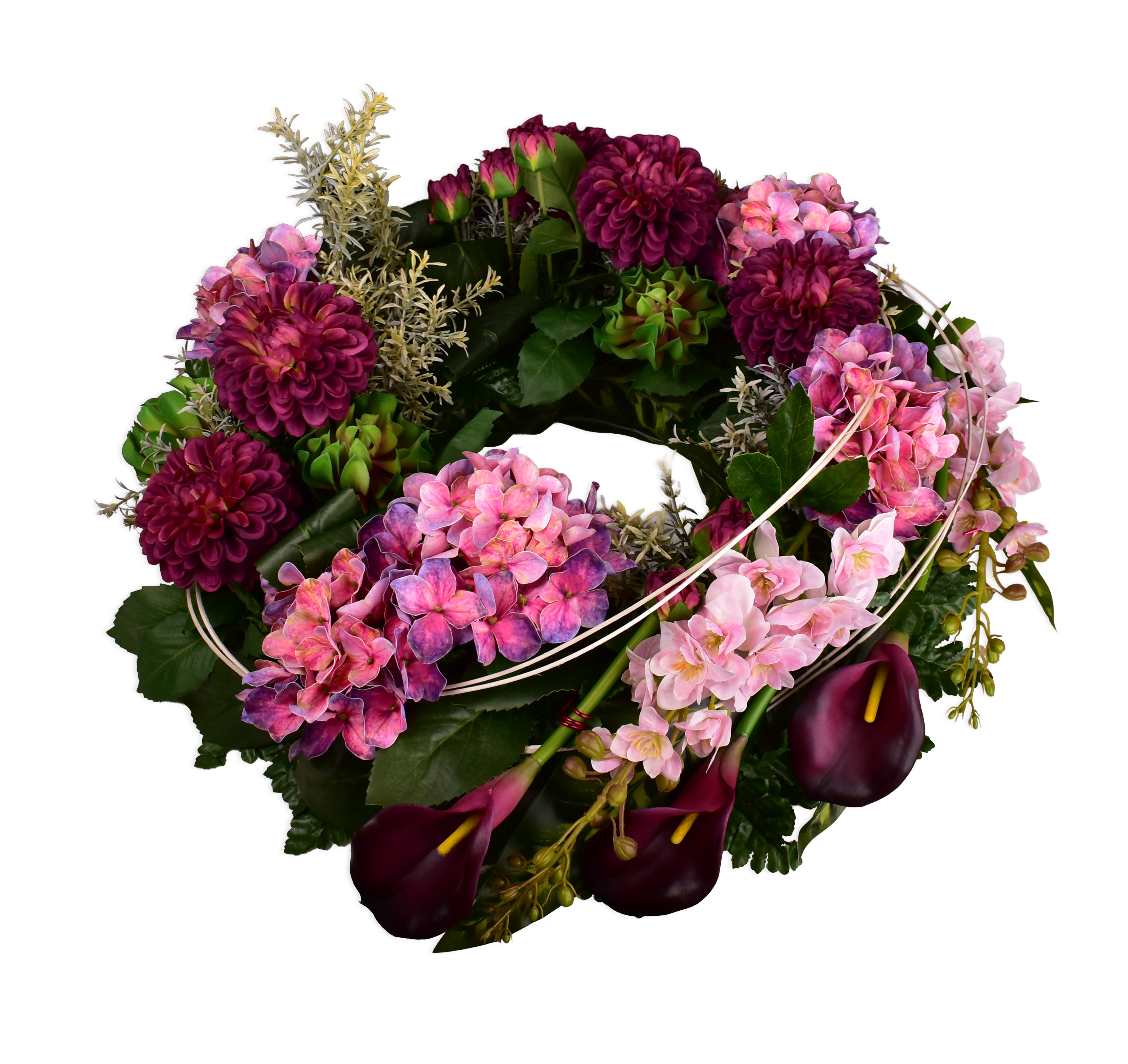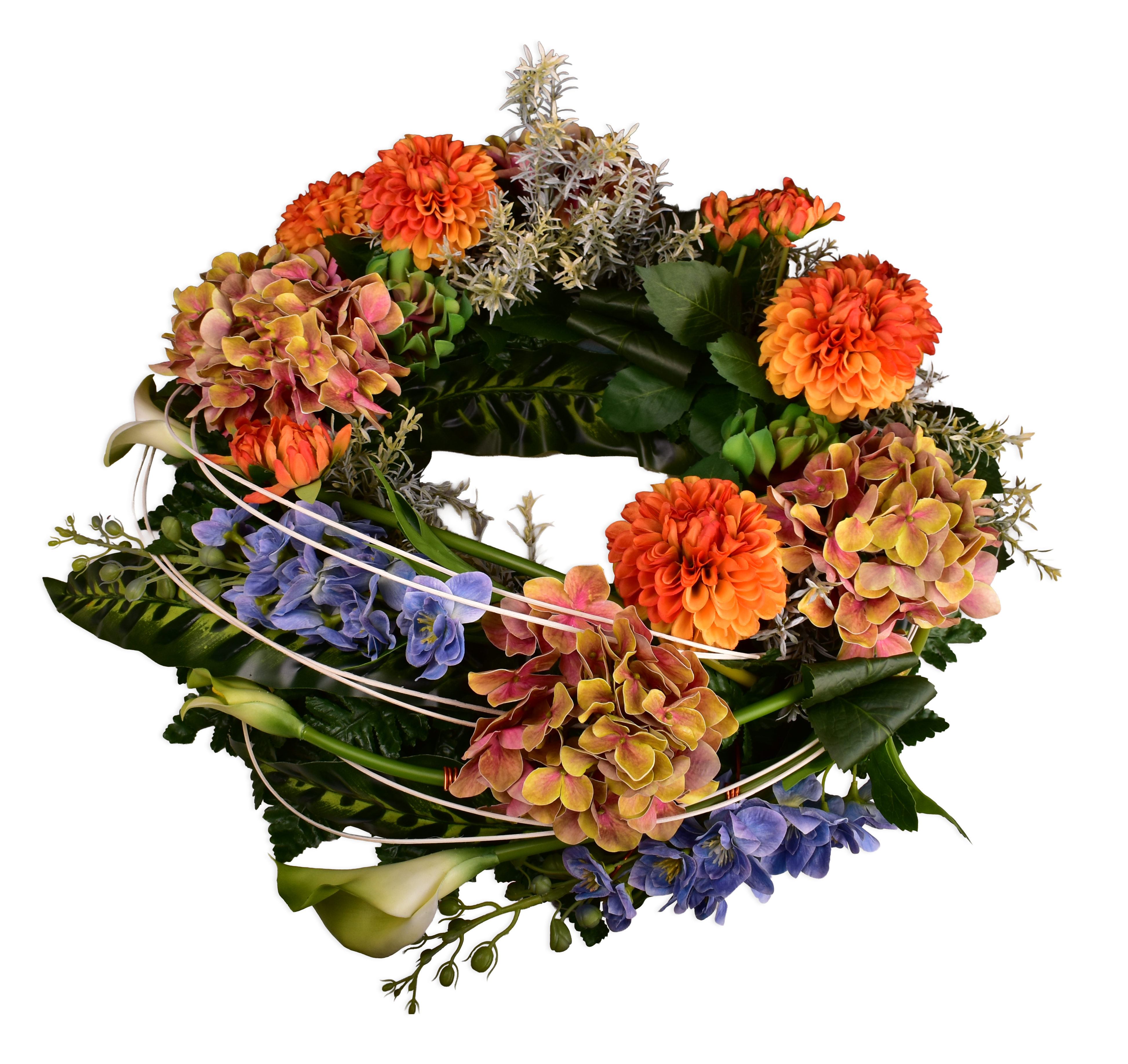 Décor d'urne, dahlia, hortensia, delphinium.