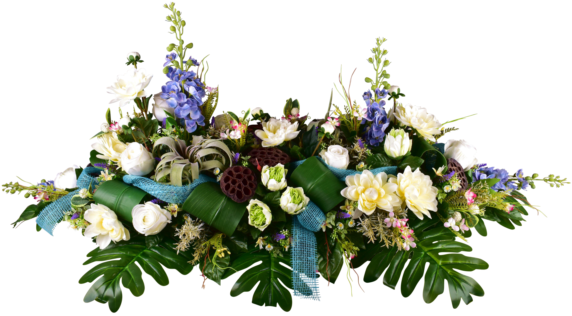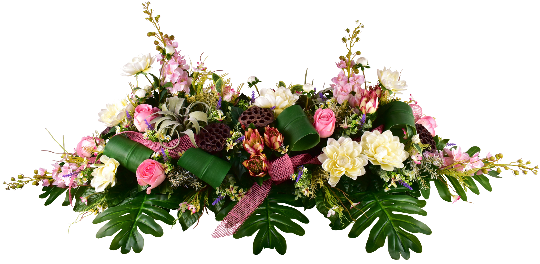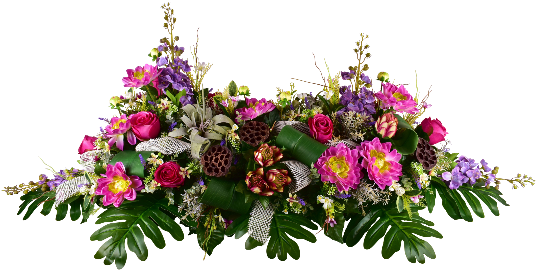 Dessus de cercueil, rose, delphinium, tillandsia, dahlia, lavande.