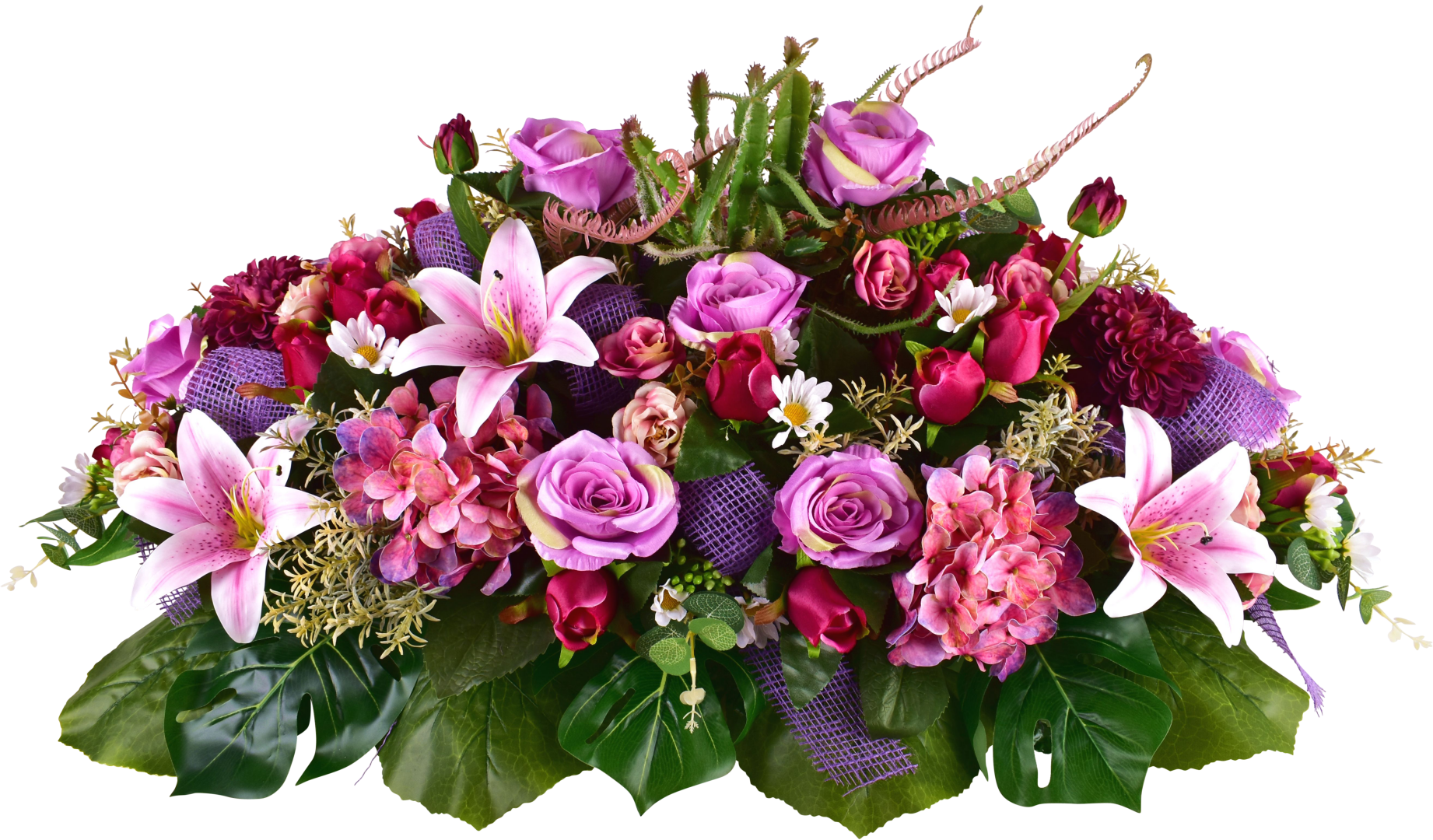 Raquette, rose, boutons, lys, dahlia, hortensia, gardénia, ruban jute, support lesté.
