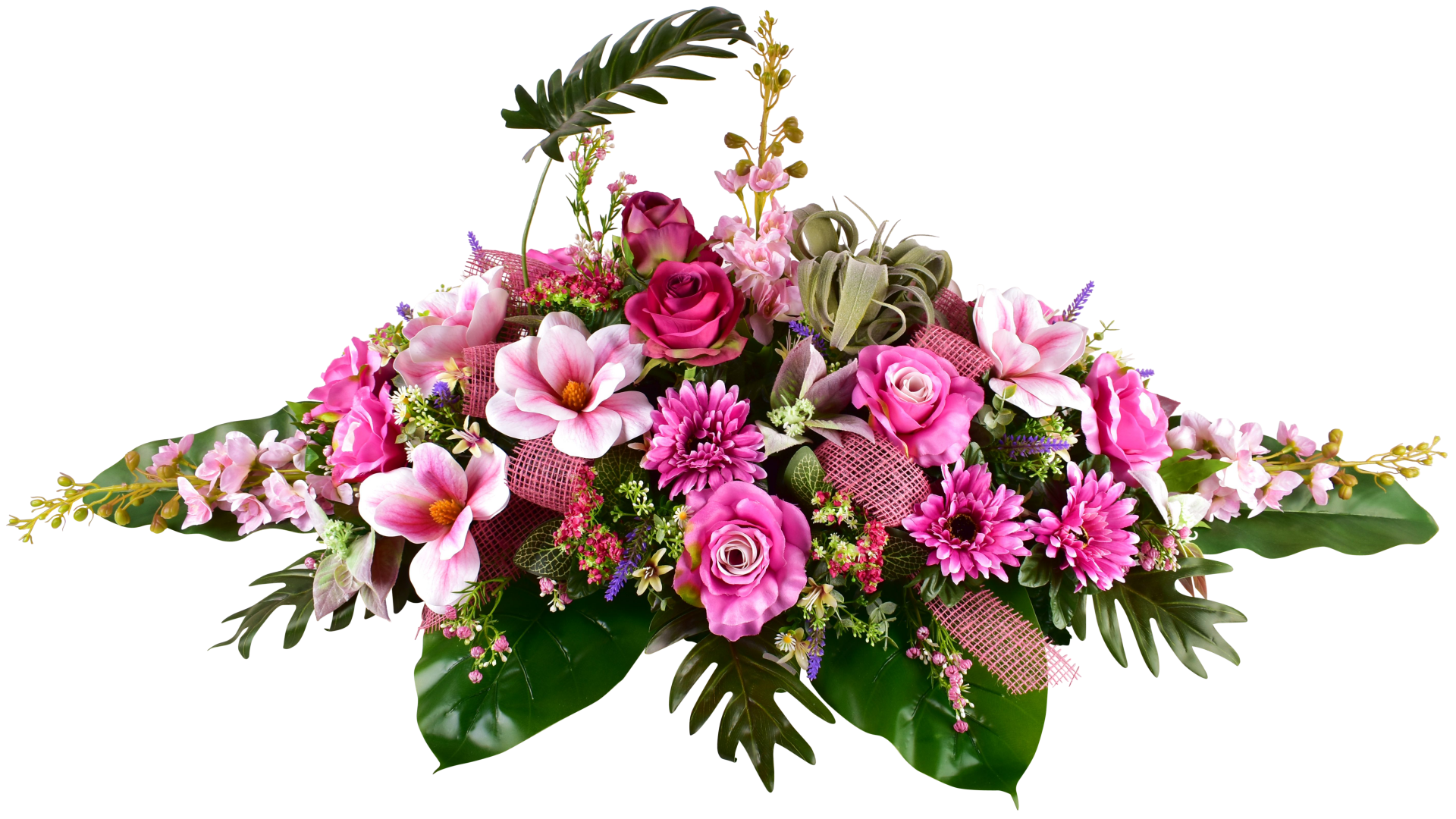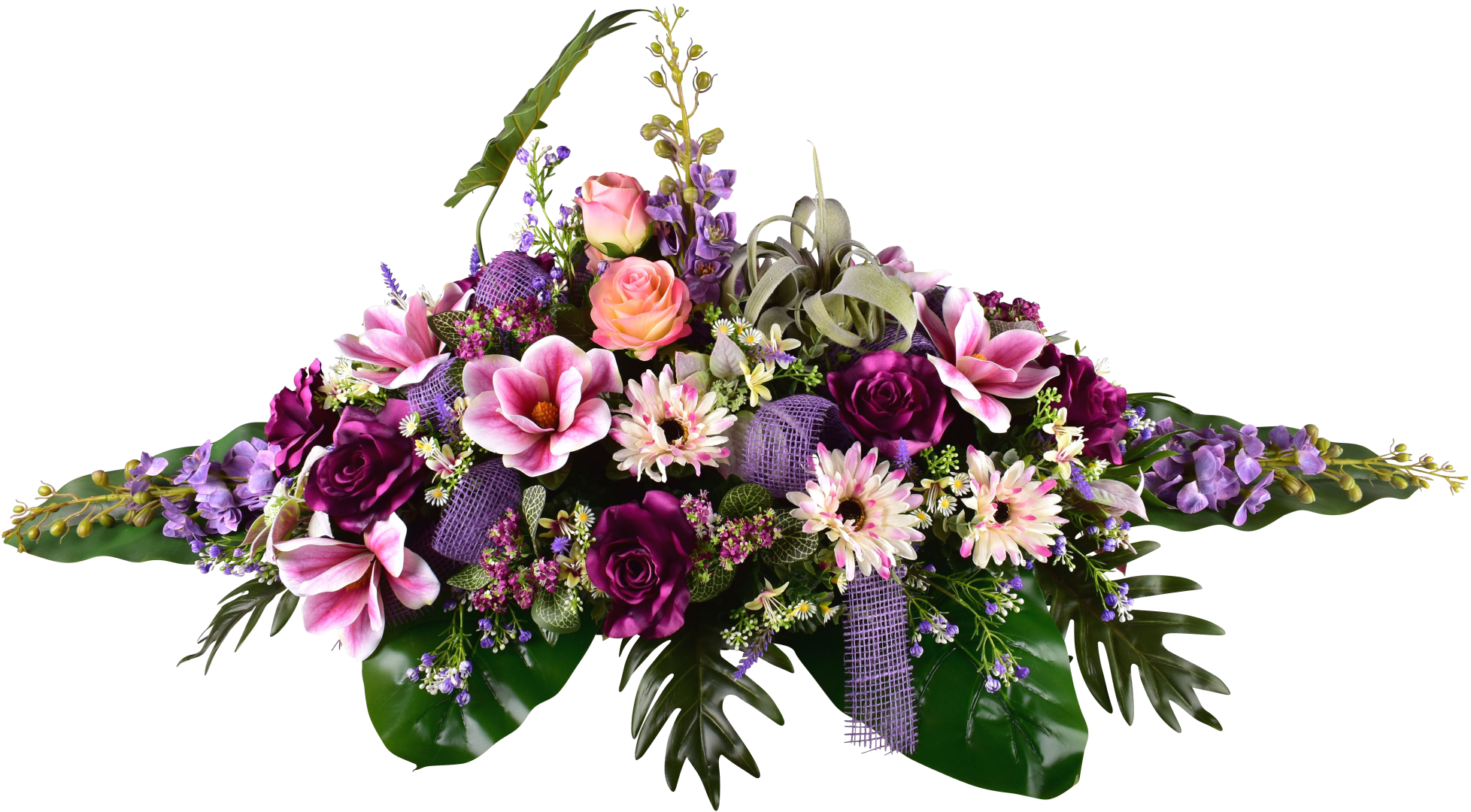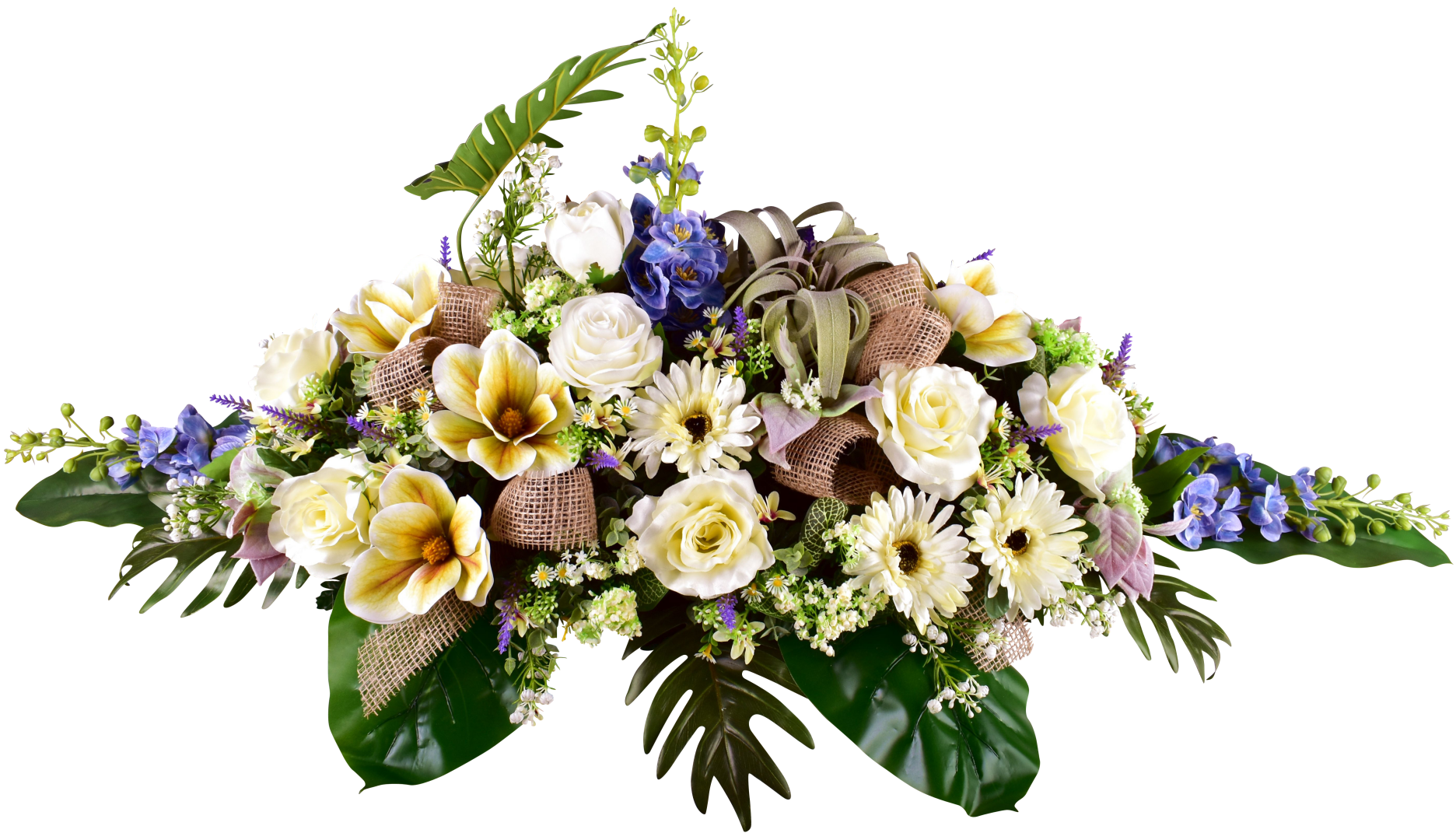 Raquette, rose, magnolia, gerbera, delphinium, tillandsia, ruban jute, support lesté.