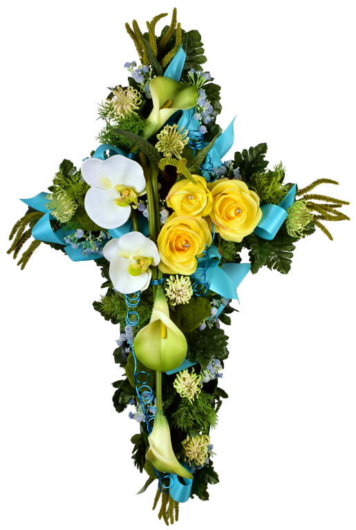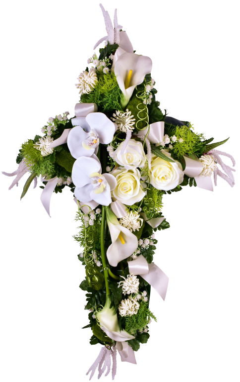 Croix, rose, phalénopsis, arum. Shamrock, gypsophile, ruban et épingles. Support lesté