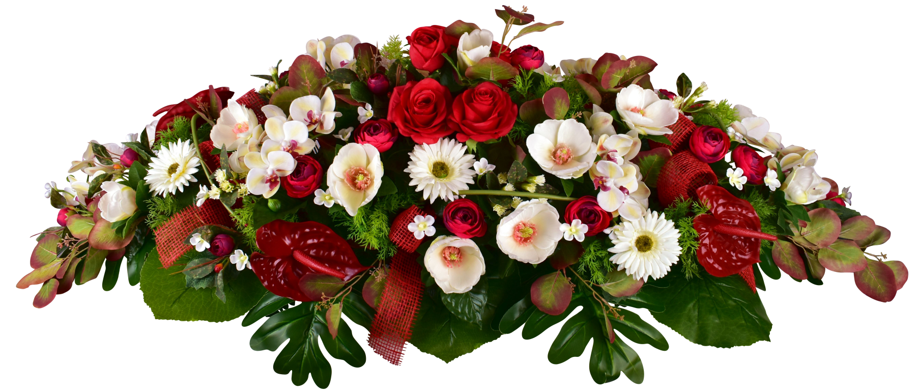 Dessus de cercueil, orchidée, rose, anthurium. Gerbera, renoncule, eucalyptus. Support lesté.