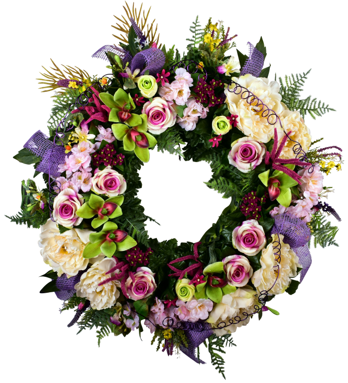 Couronne, rose, orchidée, pivoine. Cerisier, astilbe, fleur sauvage. Support lesté
