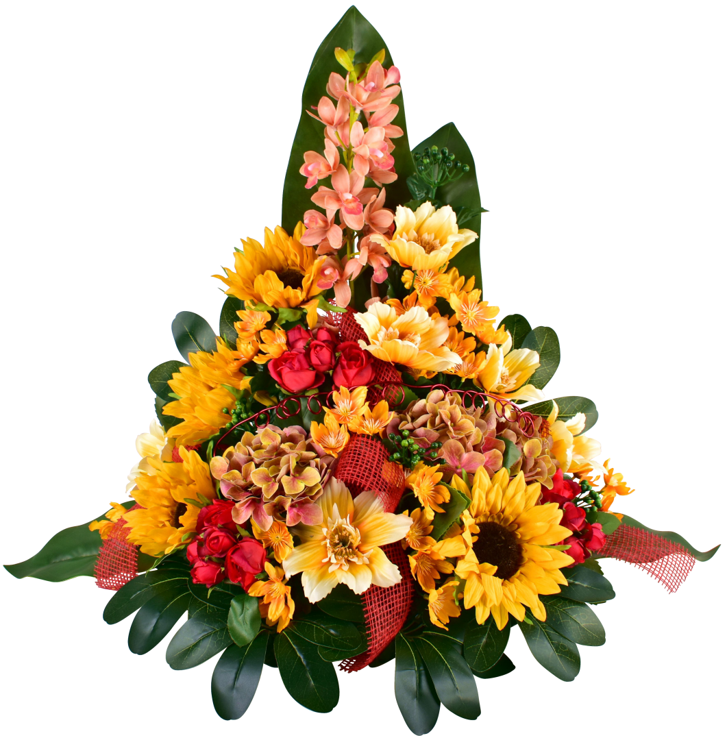 Devant de tombe, anémone, tournesol, cymbidium, rose.
