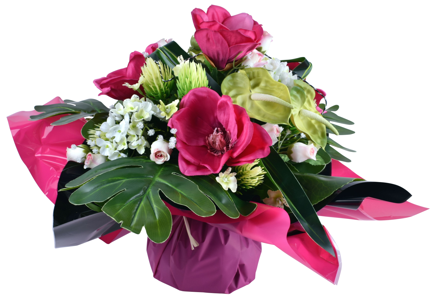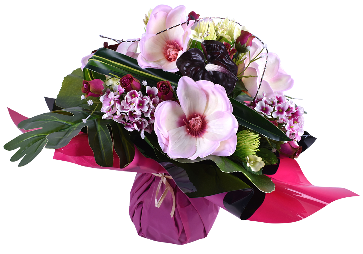Bouquet bulle de magnolia, hortensia et bouton de rose. Support lesté.