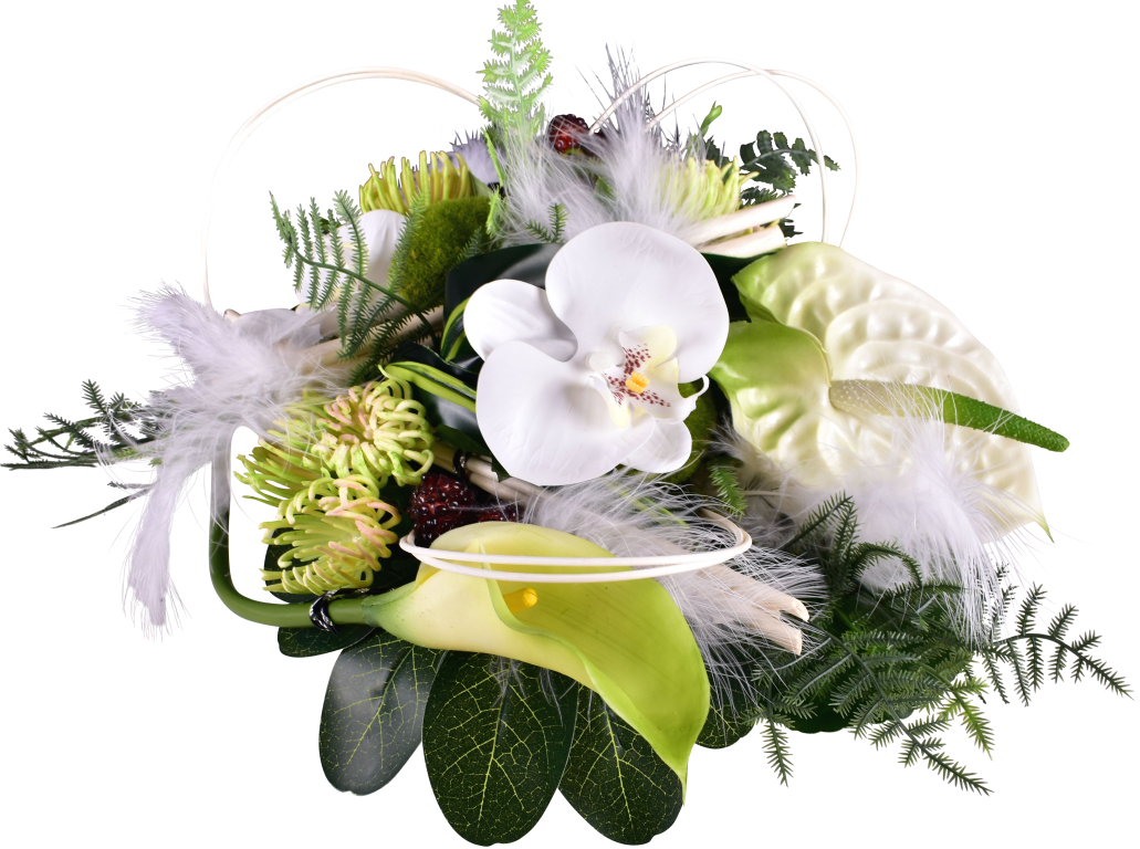 Coupe, orchidée, anthurium, arum. Shamrock, mûres. Coupe écorce lestée.