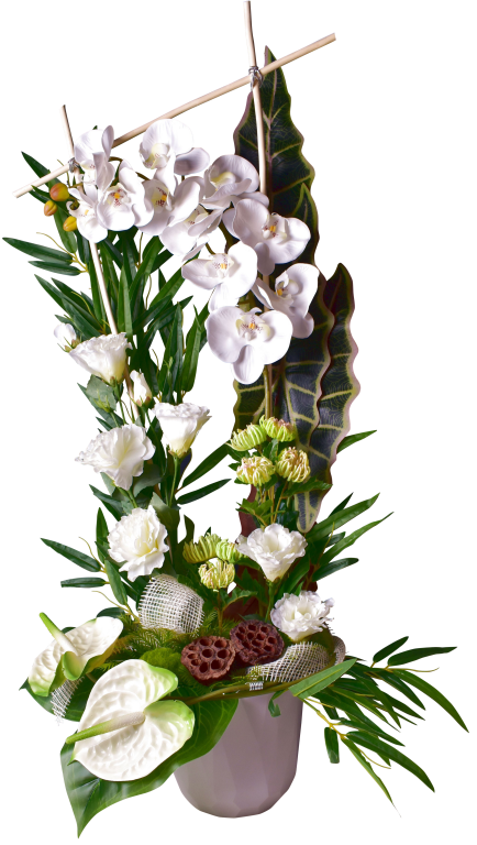 Coupe, orchidée, lysianthus, anthurium. Bambou, ruban, lotus. Contenant lesté.