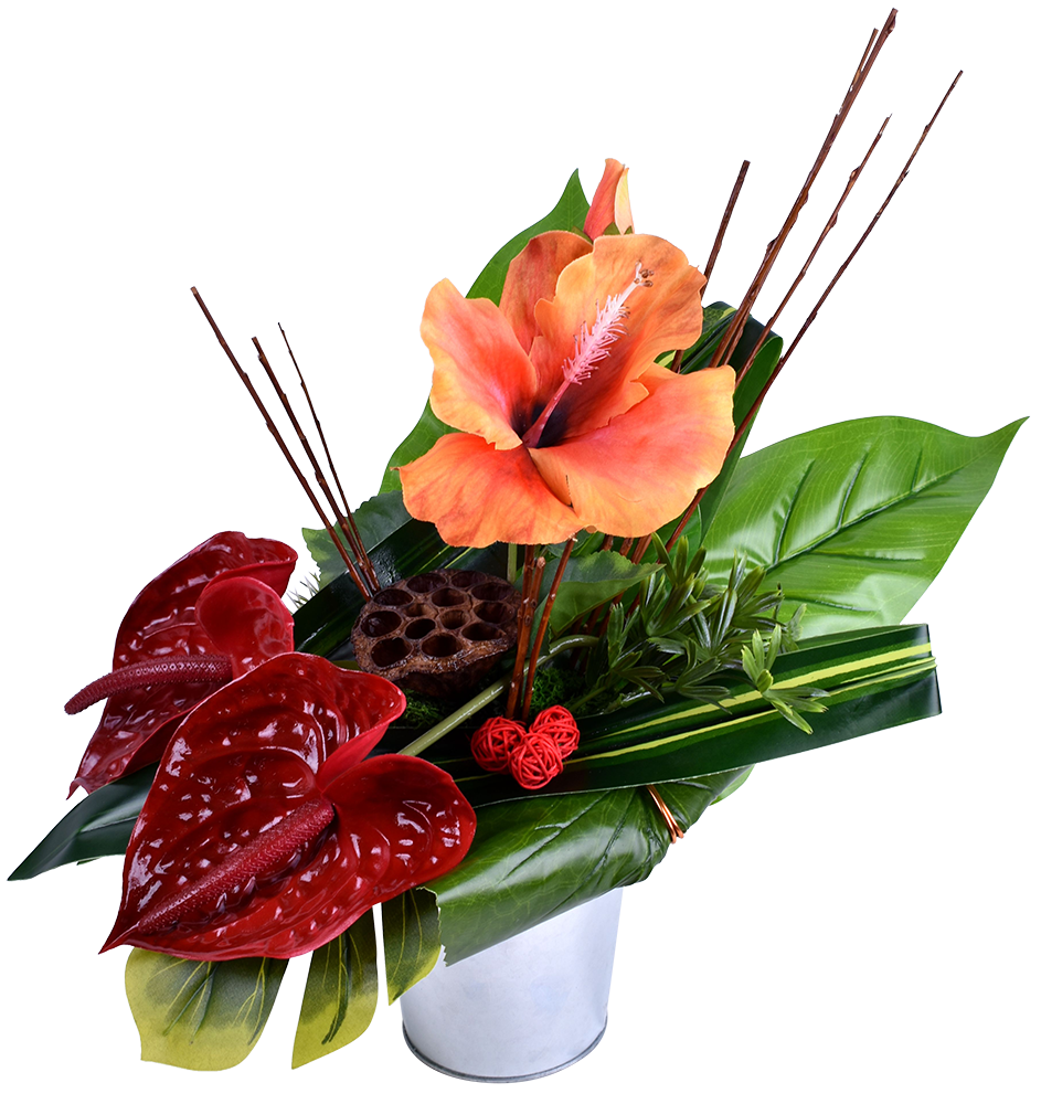 Pot zinc d'hibiscus et d'anthurium. Contenant lesté.