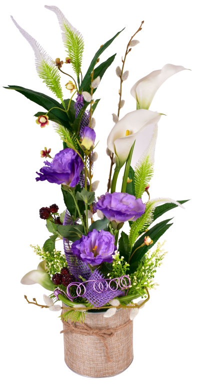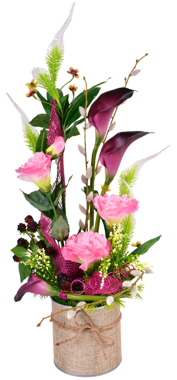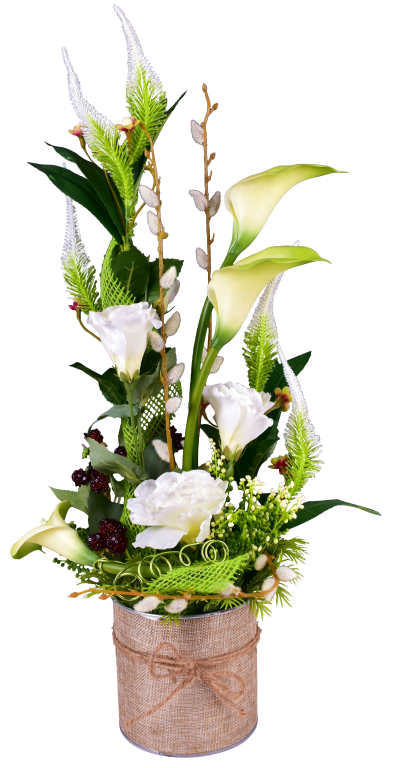 Pot déco, arum, lysianthus, véronique, baies et châton de saule. Contenant lesté.