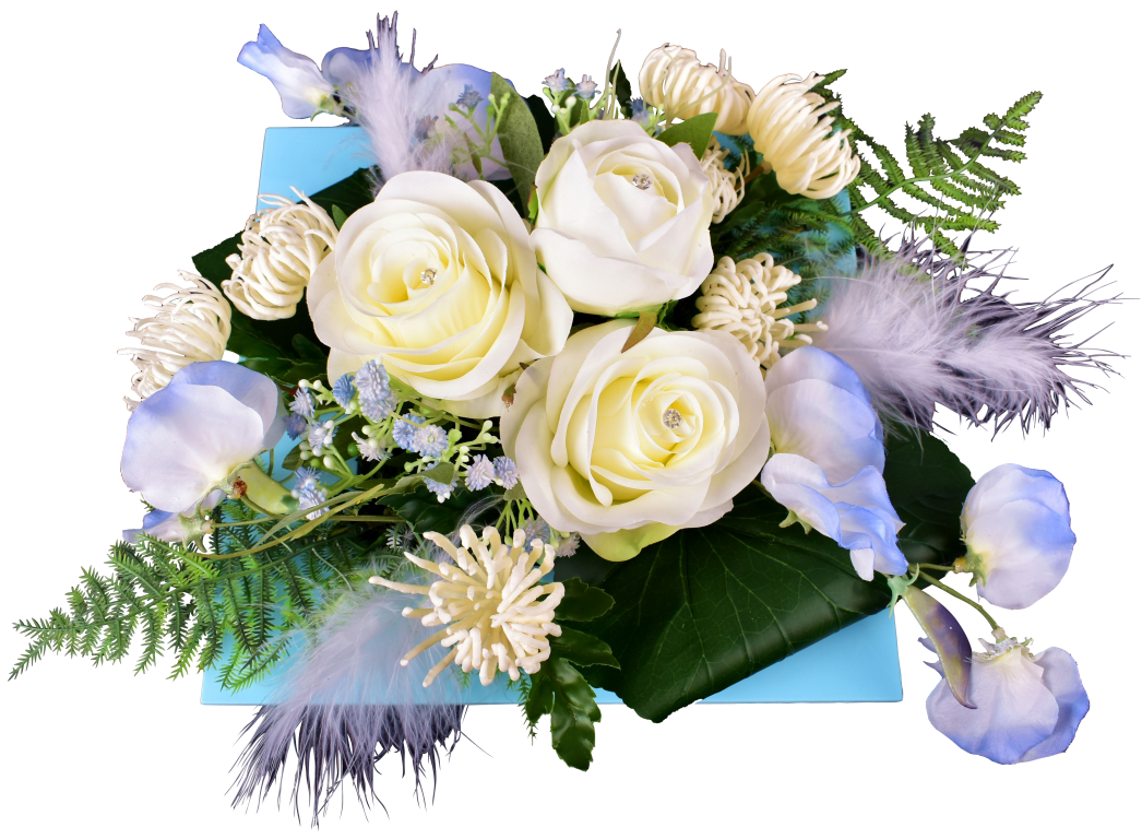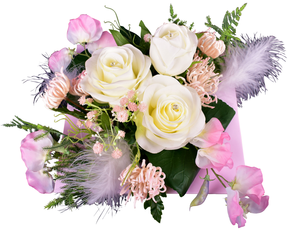 Plateau carré, pois de senteur, rose, shamerock, plumes, épingles diamant. Contenant lesté.